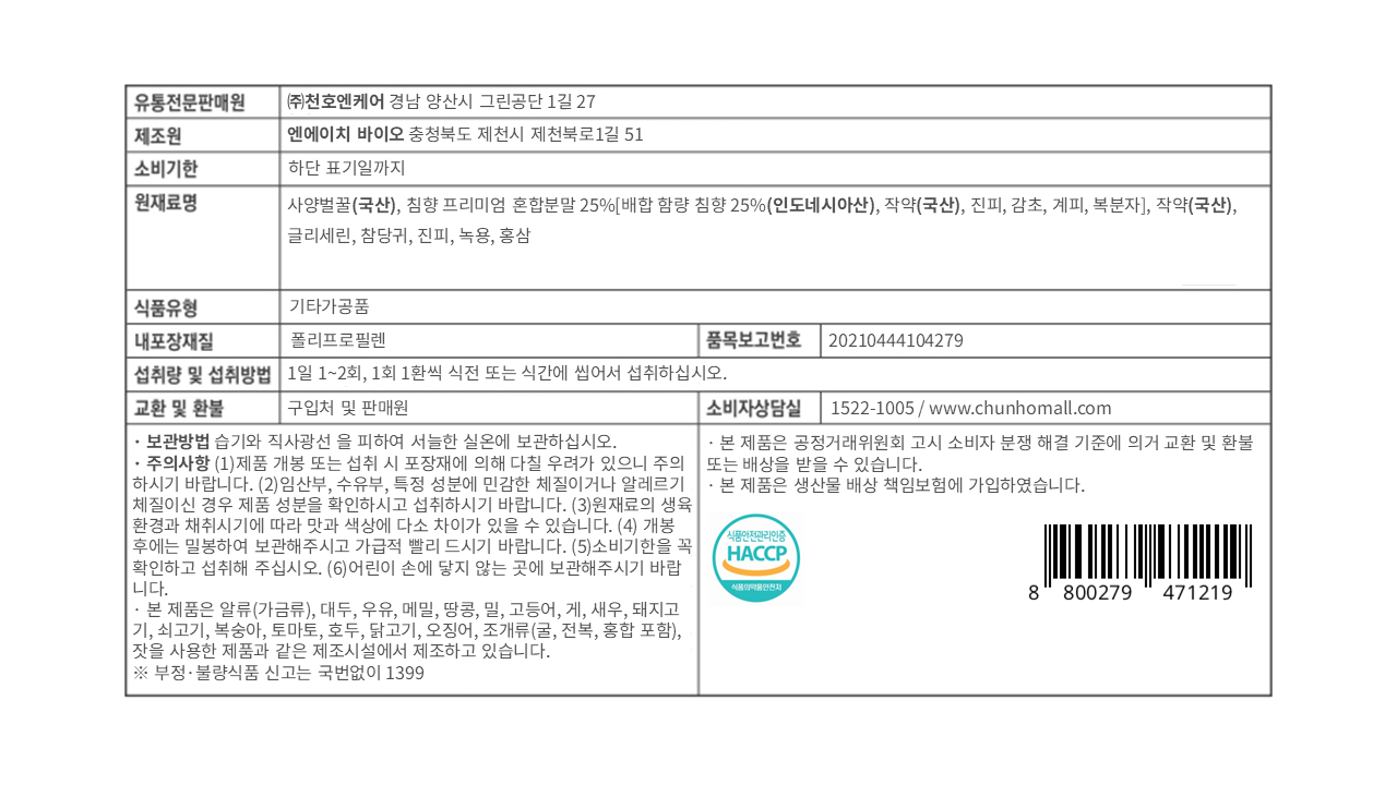 - 사양벌꿀(국산), 침향 프리미엄 혼합분말 25%(인도네시아), 작약(국산), 진피, 감초, 계피, 복분자, 참당귀, 진피 외 제품 라벨 참조