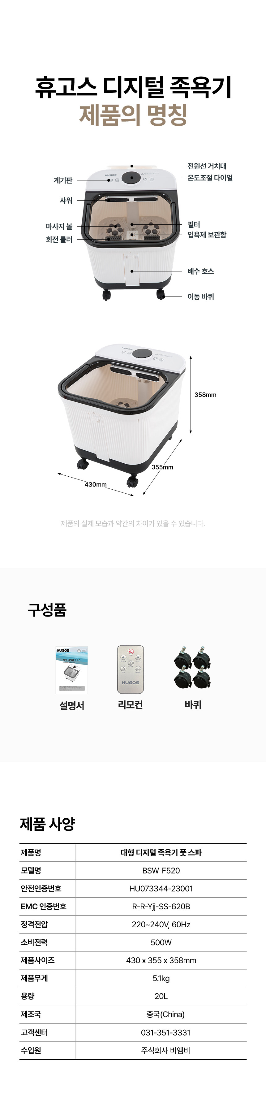 [휴고스] NEW 풋스파 대용량 20L 습식족욕기 BSW-F520