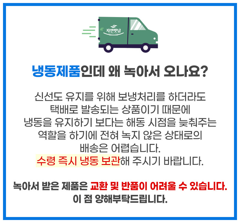• 신선식품의 경우 재판매가 불가능한 제품 특성상 단순변심 및 개인적 입맛 차이로 인한 반품은 불가능하며 제품 수령 후 문제가 있는 경우 이상부분 사진 촬영하여 수령하신 날짜 기준 2일 이내 연락해주셔야합니다.(기일은 업체별 상이할 수 있으니 수령즉시 연락 부탁드리겠습니다.)