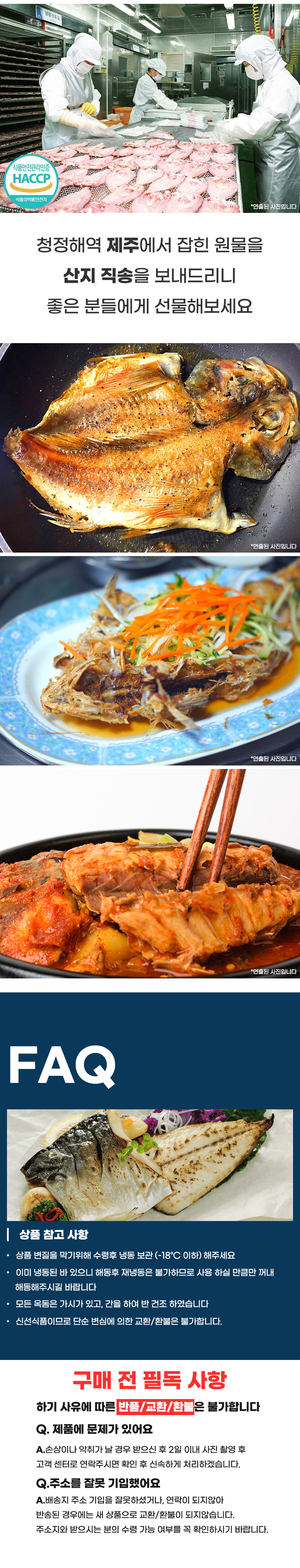 • 신선식품의 경우 재판매가 불가능한 제품 특성상 단순변심 및 개인적 입맛 차이로 인한 반품은 불가능하며 제품 수령 후 문제가 있는 경우 이상부분 사진 촬영하여 수령하신 날짜 기준 2일 이내 연락해주셔야합니다.(기일은 업체별 상이할 수 있으니 수령즉시 연락 부탁드리겠습니다.)