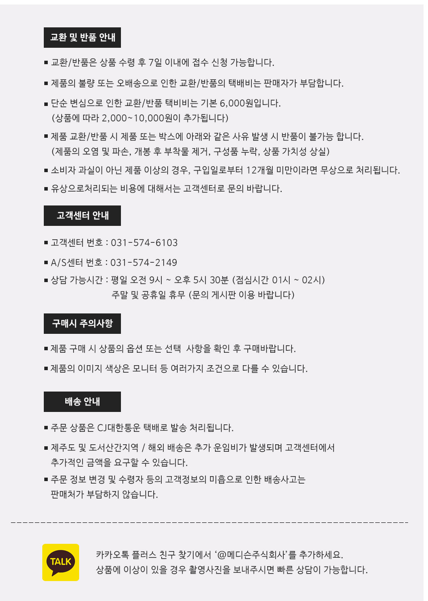 • 상품불량에 의한 반품, 교환, A/S, 환불, 품질보증 및 피해보상 등에 관한 사항은 소비자분쟁해결기준(공정거래위원회 고시)에 따라 받으실 수 있습니다.