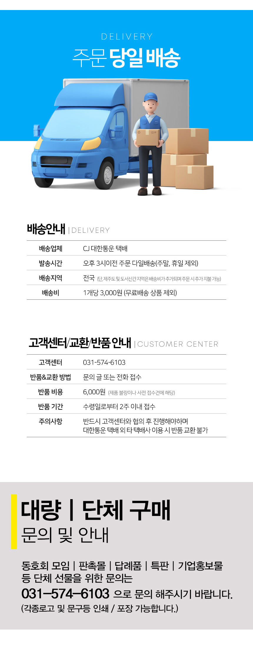 • 반품/교환은 미사용 제품에 한해 배송완료 후 7일 이내 접수하여 주십시오.