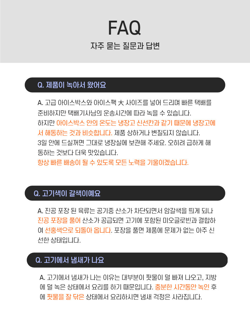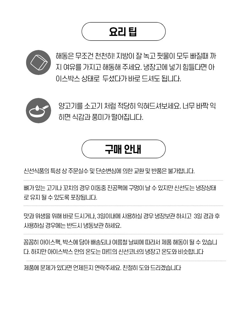 • 신선식품의 경우 재판매가 불가능한 제품 특성상 단순변심 및 개인적 입맛 차이로 인한 반품은 불가능하며 제품 수령 후 문제가 있는 경우 이상부분 사진 촬영하여 수령하신 날짜 기준 2일 이내 연락해주셔야합니다.(기일은 업체별 상이할 수 있으니 수령즉시 연락 부탁드리겠습니다.)