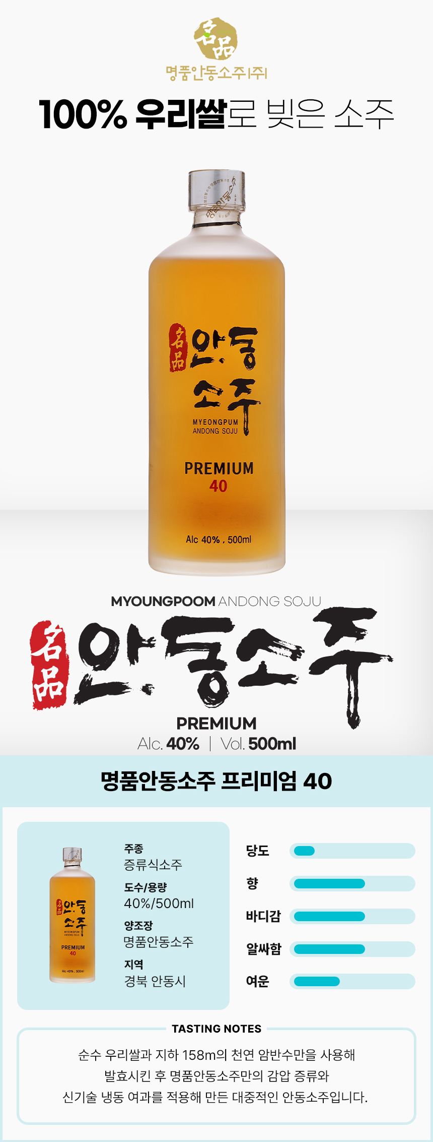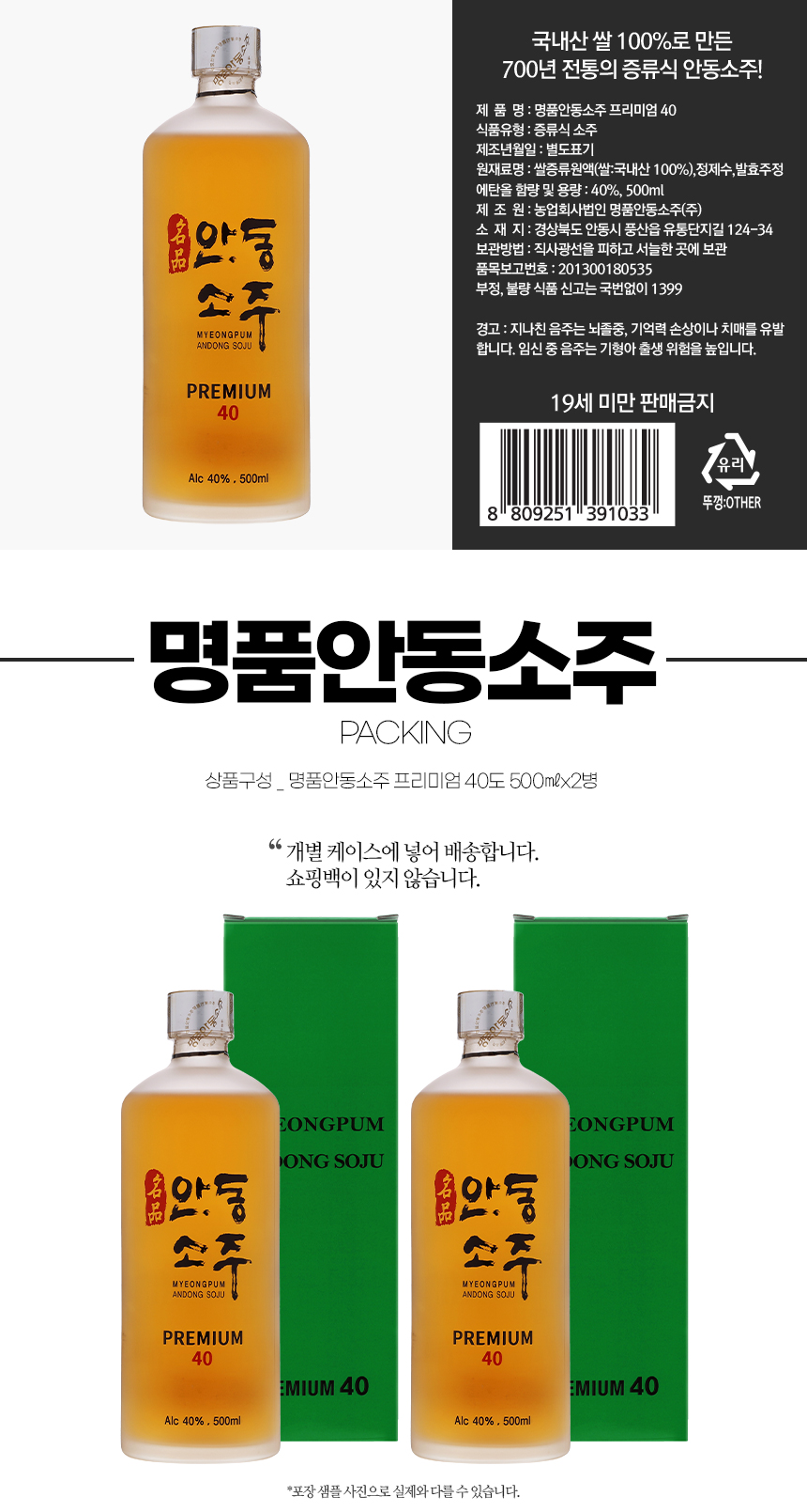 명품안동소주 프리미엄40 500mlx2 오크증류주브렌딩