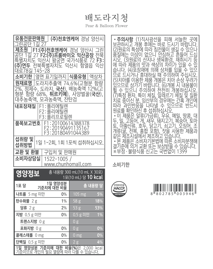 • [천호엔케어] 배도라지청 3개월분 (10mlx30포x3박스)
