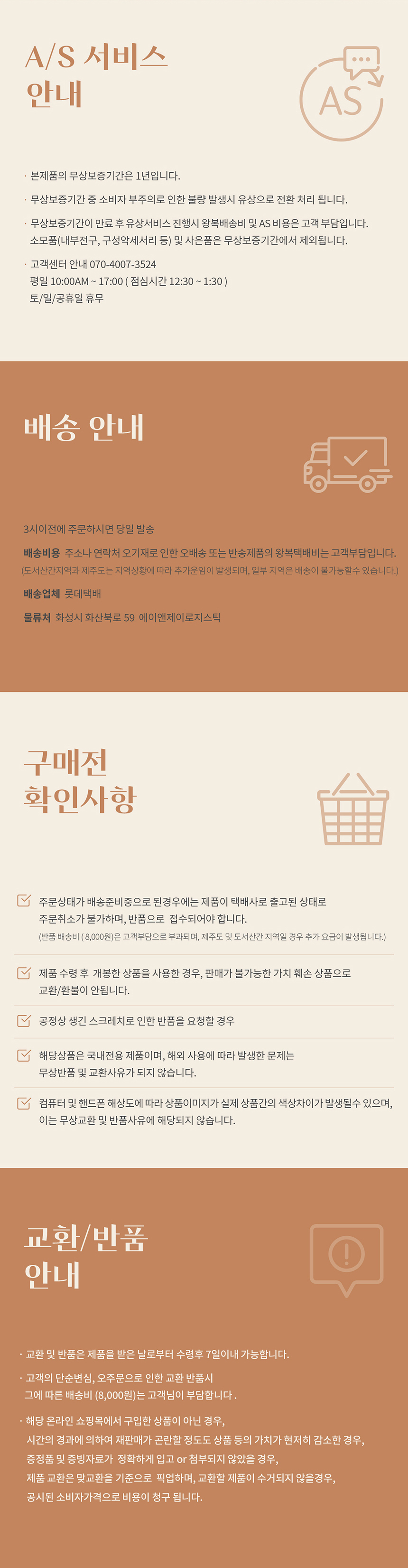 • 반품/교환은 미사용 제품에 한해 배송완료 후 7일 이내 접수하여 주십시오.