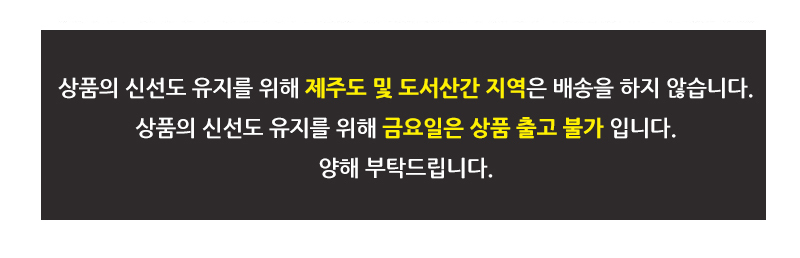 • 신선식품의 경우 재판매가 불가능한 제품 특성상 단순변심 및 개인적 입맛 차이로 인한 반품은 불가능하며 제품 수령 후 문제가 있는 경우 이상부분 사진 촬영하여 수령하신 날짜 기준 2일 이내 연락해주셔야합니다.(기일은 업체별 상이할 수 있으니 수령즉시 연락 부탁드리겠습니다.)