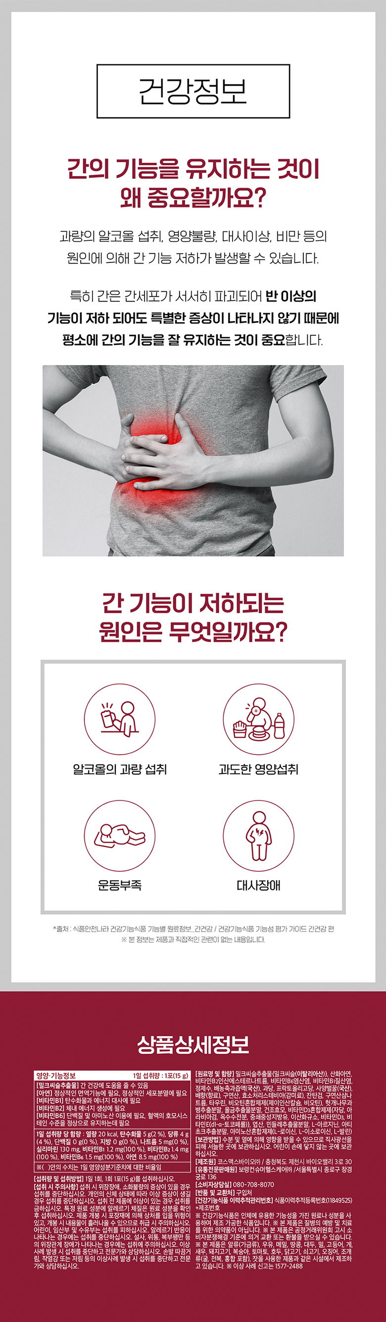 - 1일 섭취량 당 함량 : 열량 20Kcal, 탄수화물 5g(2%), 당류 4g(4%), 단백질0g(0%), 지방0g(0%), 나트륨 5mg(0%), 실리마린 130mg, 비타민B1 1.2mg (100%), 비타민B2 1.4mg(100%), 비타민B6 1.5mg(100%), 아연 8.5mg(100%)