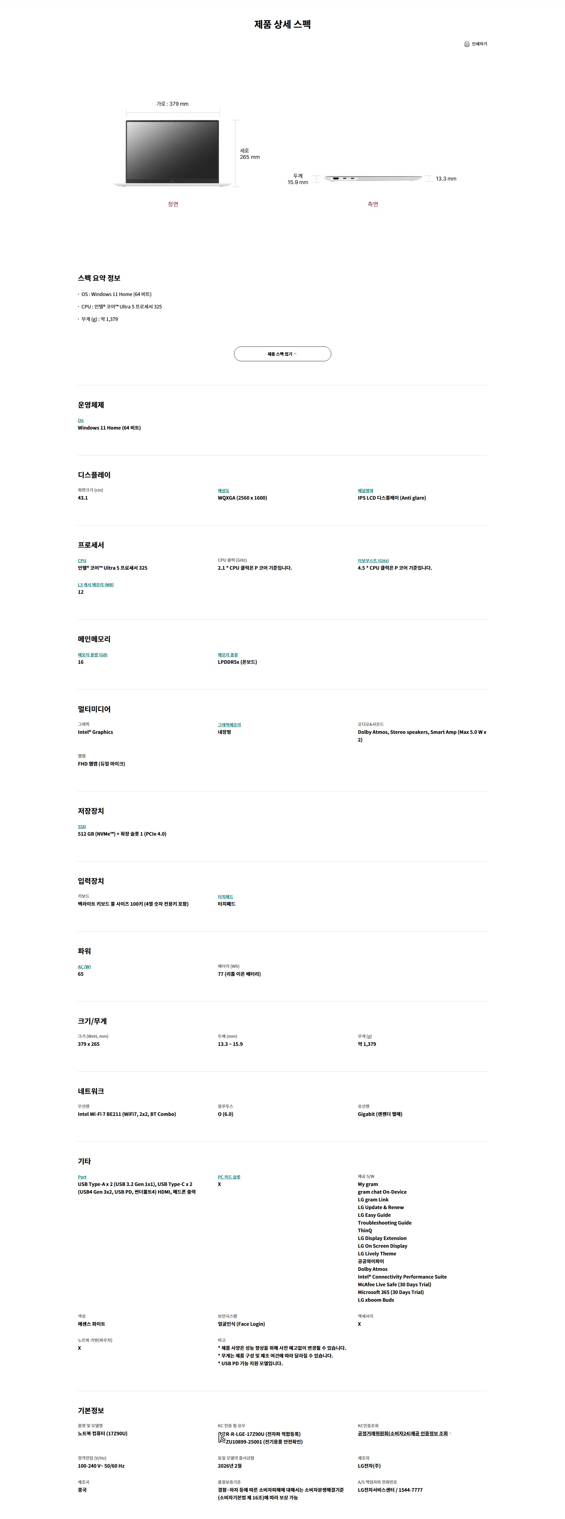 [LG전자] 17인치 그램 Pro AI 2026 (17Z90U-GS5WK) / 코어 울트라 5 / RAM 16GB / SSD 512GB / 윈도우11 홈