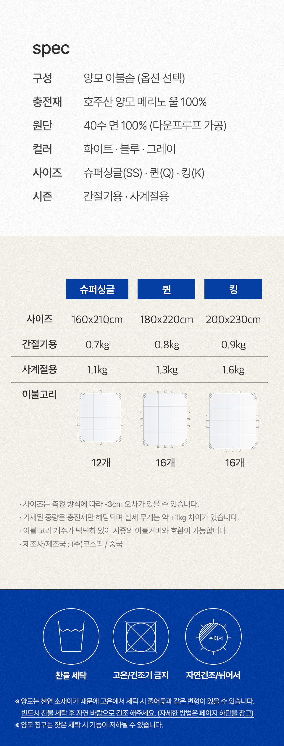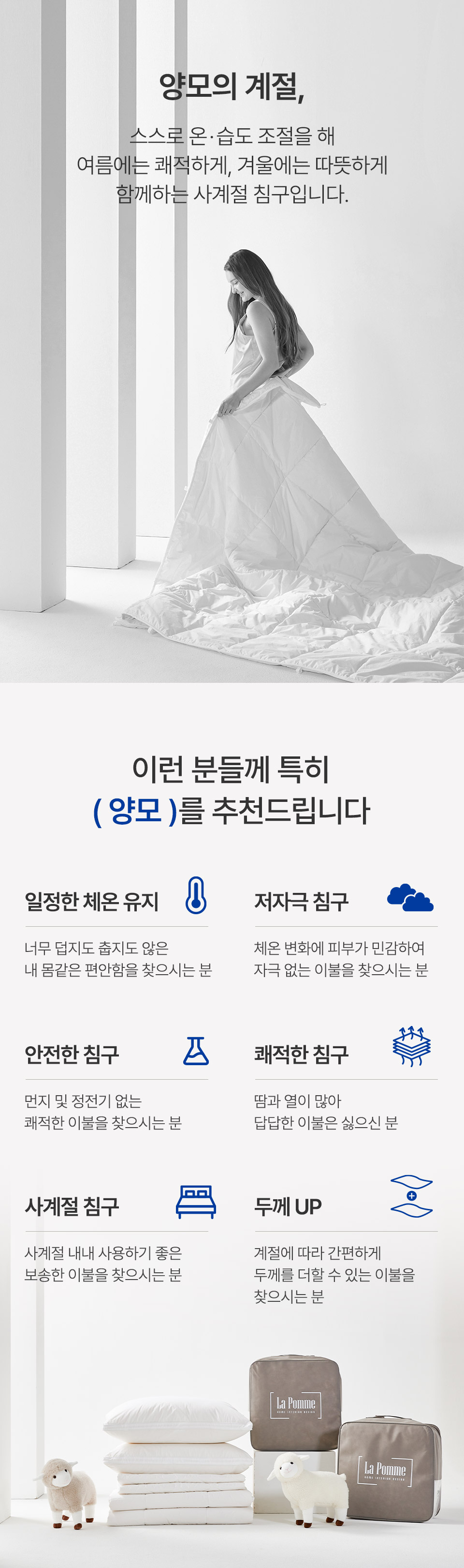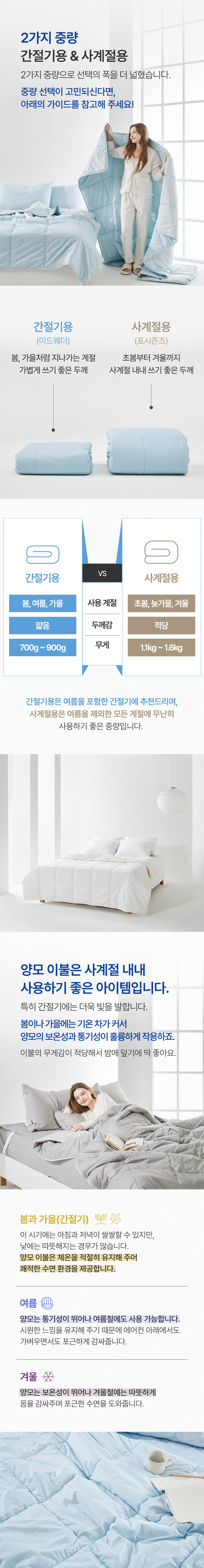 [라뽐므] 간절기/사계절용 투월런 40수 100% 호주산 천연양모 이불솜 SS,Q,K 택1
