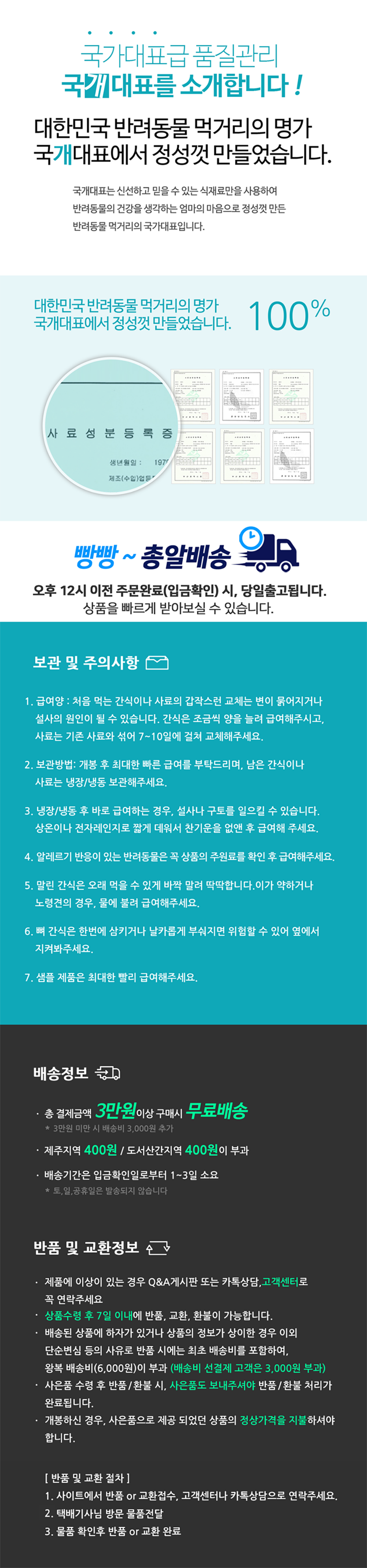 • 신선식품의 경우 재판매가 불가능한 제품 특성상 단순변심 및 개인적 입맛 차이로 인한 반품은 불가능하며 제품 수령 후 문제가 있는 경우 이상부분 사진 촬영하여 수령하신 날짜 기준 2일 이내 연락해주셔야합니다.(기일은 업체별 상이할 수 있으니 수령즉시 연락 부탁드리겠습니다.)