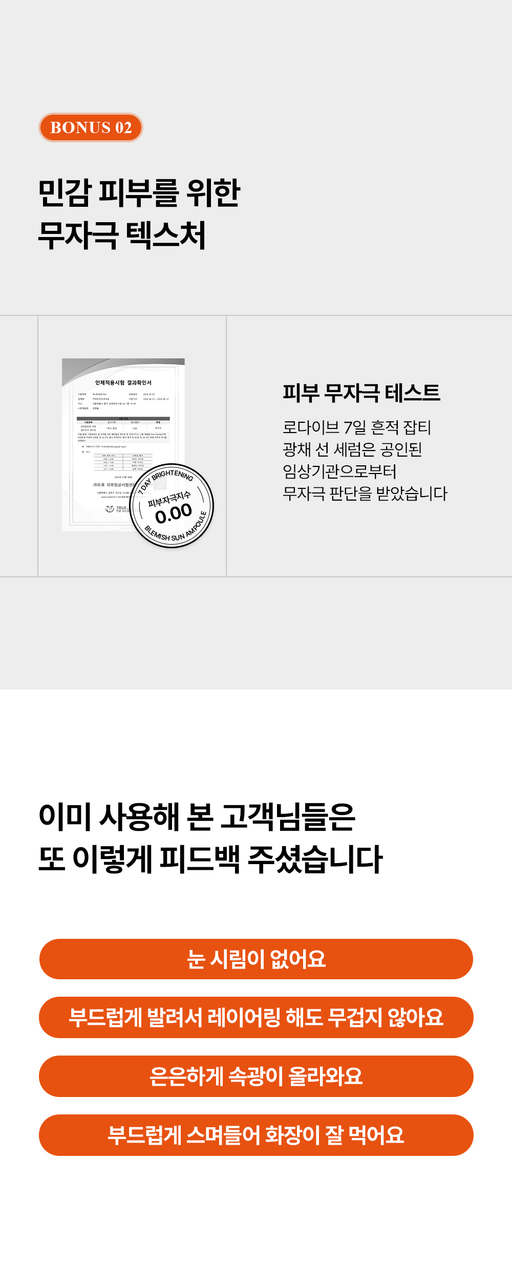 - 저자극 제품이지만 예민하거나 약한 피부의 경우 사용 전 반드시 '패치 테스트 후' 제품 적응 기간을 가지시는 것을 권장 드립니다. 사용 시에는 눈가를 피해 사용해 주시고, 상처가 있거나 피부 이상이 있는 부위는 사용을 멈춰주세요. 제품이 눈에 들어갔을 때에는 물로 씻어내고, 이상이 있는 경우에는 전문의와 상담을 권장 드려요.