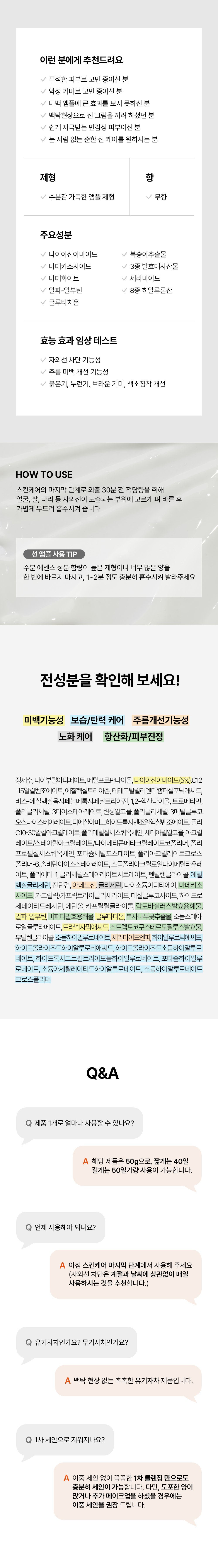 - 1,2-헥산다이올 C12-15알킬벤조에이트 글루타티온 글리세린 글리세릴스테아레이트시트레이트 나이아신아마이드 다이부틸아디페이트 다이소듐이디티에이 데실글루코사이드 디에칠아미노하이드록시벤조일헥실벤조에이트 락토바실러스발효용해물 마데카소사이드 메틸프로판다이올 변성알코올 복사나무꽃추출물 부틸렌글라이콜 비스-에칠헥실옥시페놀메톡시페닐트리아진 비피다발효용해물 세라마이드엔피 세테아릴알코올 소듐스테아로일글루타메이트 소듐아세틸레이티드하이알루로네이트 소듐폴리아크릴로일다이메틸타우레이트 소듐하이알루로네이트 소듐하이알루로네이트크로스폴리머 솔비탄아이소스테아레이트 스트렙토코쿠스 테르모필루스발효물 아데노신 아크릴레이트/스테아릴아크릴레이트/다이메티콘메타크릴레이트코폴리머 알파-알부틴 에칠헥실트리아존 에탄올 에틸헥실글리세린 잔탄검 정제수 카프릴릭/카프릭트라이글리세라이드 카프릴릴글라이콜 테레프탈릴리덴디 퍼설포닉애씨드 트라넥사믹애씨드 트로메타민 펜틸렌글라이콜 포타슘세틸포스페이트 포타슘하이알루로네이트 폴리C10-30알킬아크릴레이트 폴리글리세릴-3다이스테아레이트 폴리글리세릴-3메틸글루코오스다이스테아레이트 폴리메틸실세스퀴옥세인 폴리아크릴레이트크로스폴리머-6 폴리에터-1 폴리프로필실세스퀴옥세인 하이드로제네이티드레시틴 하이드록시프로필트라이모늄하이알루로네이트 하이드롤라이즈드소듐하이알루로네이트 하이드롤라이즈드하이알루로닉애씨드 하이알루로닉애씨드