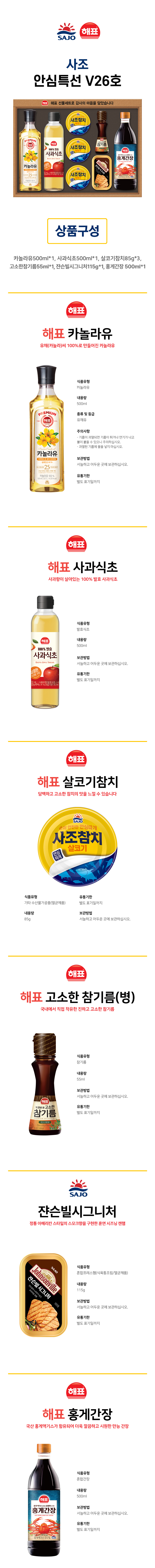 • 카놀라유500ml*1, 사과식초500ml*1, 살코기참치85g*3, 고소한참기름55ml*1, 쟌슨빌시그니처115g*1, 홍게간장500ml*1