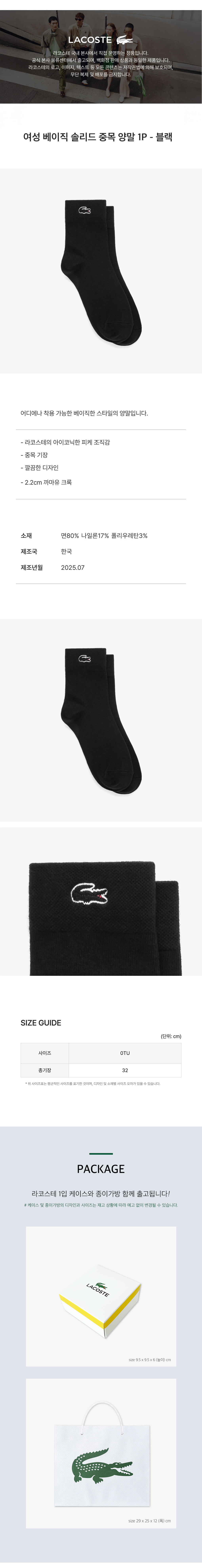 [라코스테] 여성 베이직 솔리드 중목양말1P-블랙