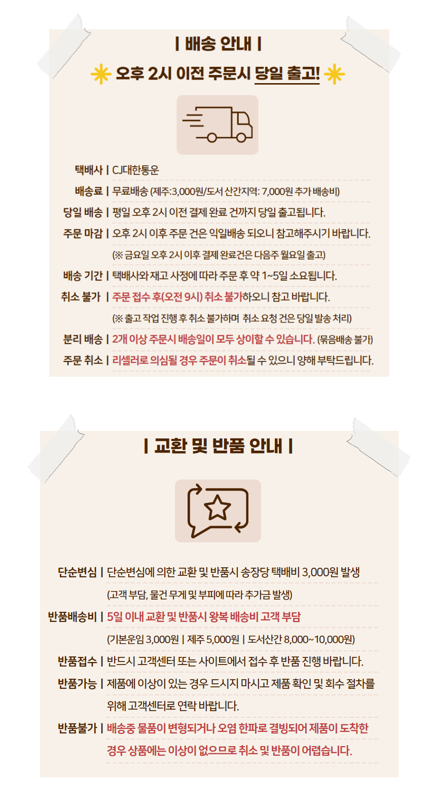 상품상세설명에 배송/교환/반품/취소 관련 안내가 기재된 경우 다음 안내사항보다 우선 적용됩니다.