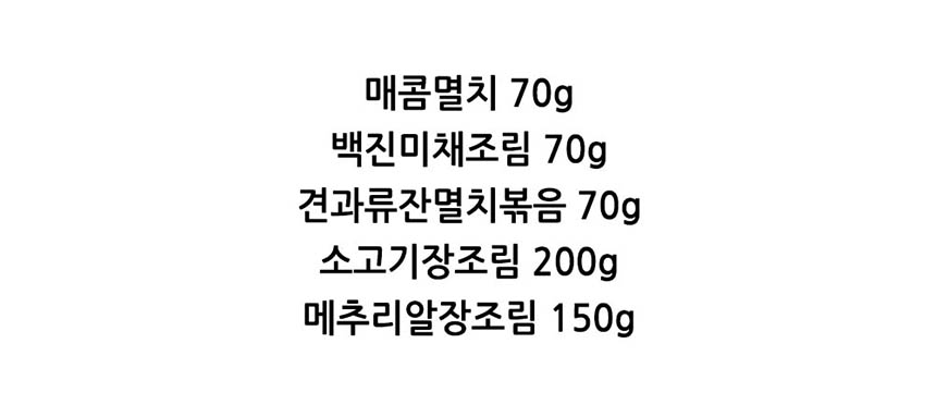 • 매콤멸치 70g 백진미채조림 70g 견과류잔멸치볶음 70g 소고기장조림 200g 메추리알장조림 150g