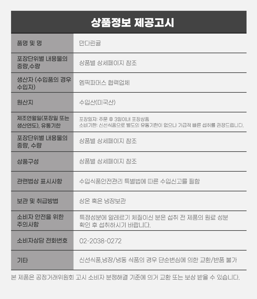 • 신선식품의 경우 재판매가 불가능한 제품 특성상 단순변심 및 개인적 입맛 차이로 인한 반품은 불가능하며 제품 수령 후 문제가 있는 경우 이상부분 사진 촬영하여 수령하신 날짜 기준 2일 이내 연락해주셔야합니다.(기일은 업체별 상이할 수 있으니 수령즉시 연락 부탁드리겠습니다.)