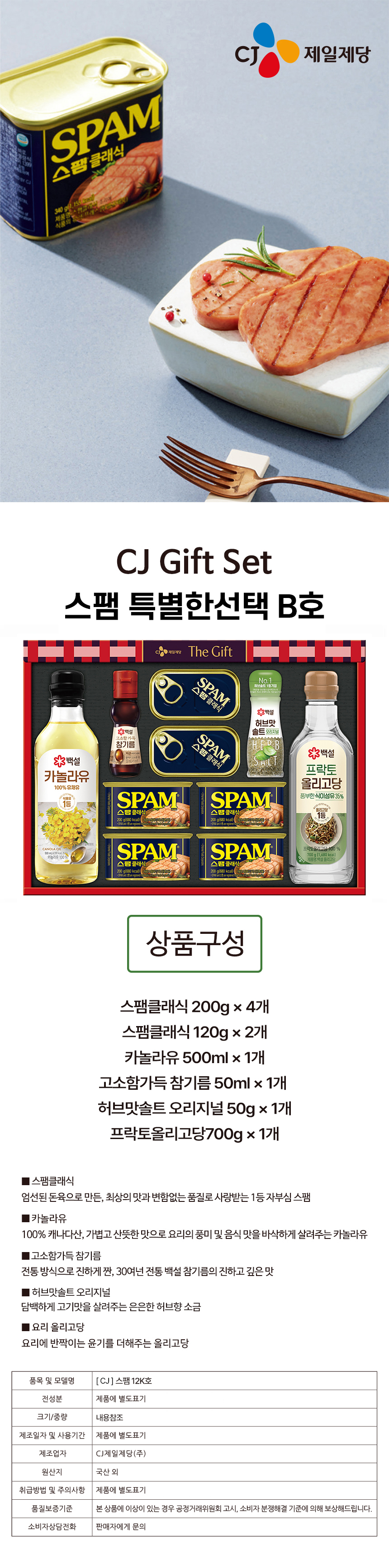 • 스팸클래식 200g 4개, 스팸클래식 120g 2개, 카놀라유 500ml 1개, 고소함가득 참기름 50ml 1개, 허브맛솔트 오리지널 50g 1개, 프락토올리고당700g 1개