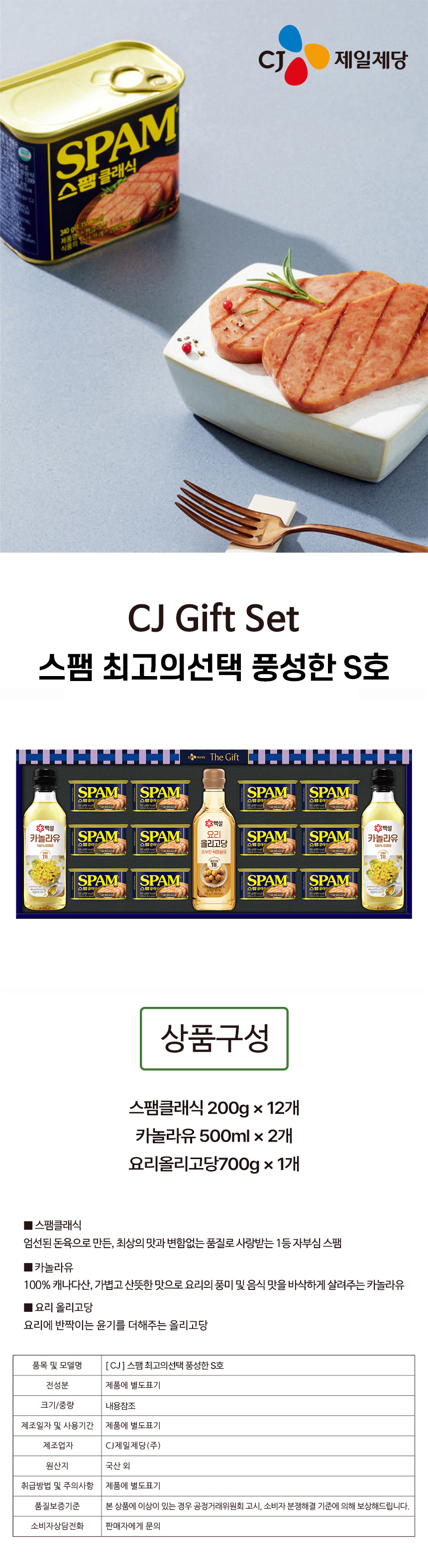 - 스팸클래식 200g 12개, 카놀라유 500ml 2개, 요리올리고당700g 1개