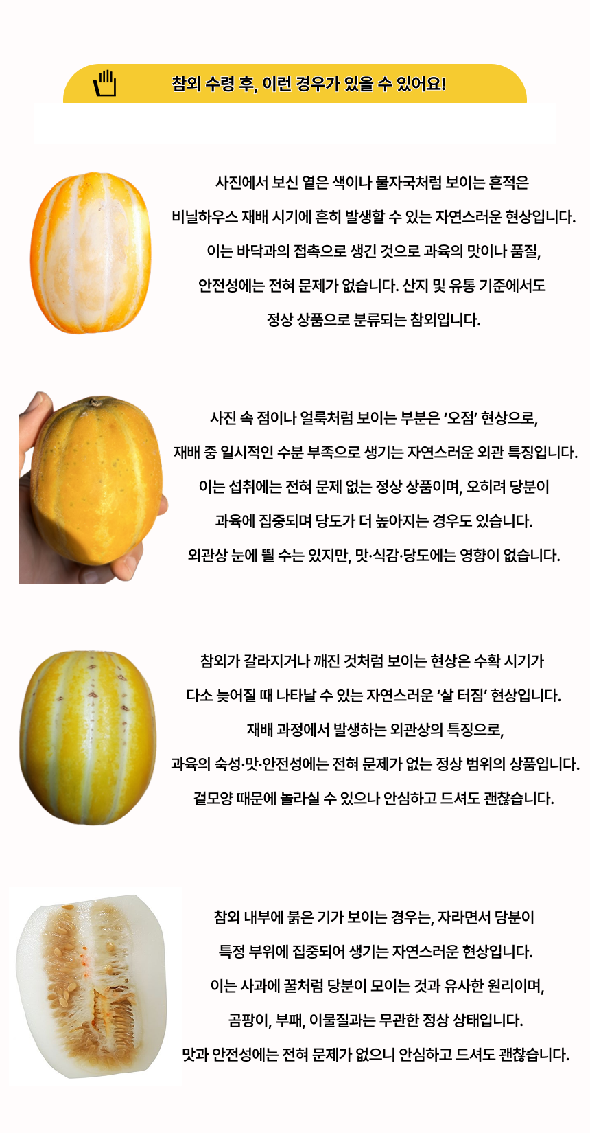 - 신선식품의 경우 재판매가 불가능한 제품 특성상 단순변심 및 개인적 입맛 차이로 인한 반품은 불가능하며 제품 수령 후 문제가 있는 경우 이상부분 사진 촬영하여 수령하신 날짜 기준 2일 이내 연락해주셔야합니다.(기일은 업체별 상이할 수 있으니 수령즉시 연락 부탁드리겠습니다.)