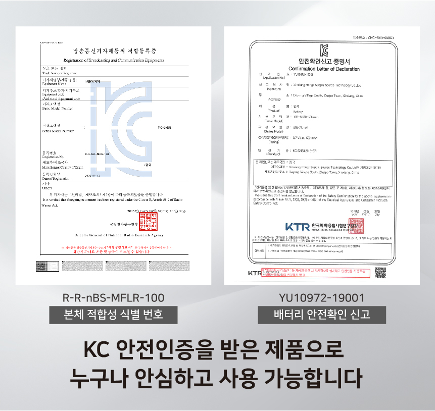 • KC 인증정보 (「전기용품 및 생활용품 안전관리법」에 따른 안전인증ㆍ안전확인ㆍ공급자적합성확인대상제품 및 「전파법」에 따른 적합인증ㆍ적합등록 대상 기자재에 한함)