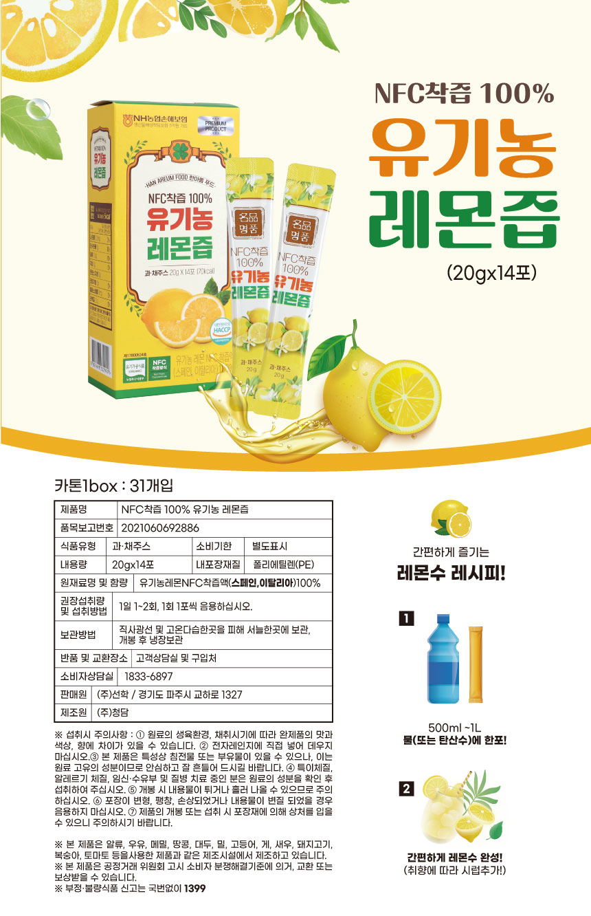 [한아름푸드] NFC착즙 유기농레몬즙 20g * 14포