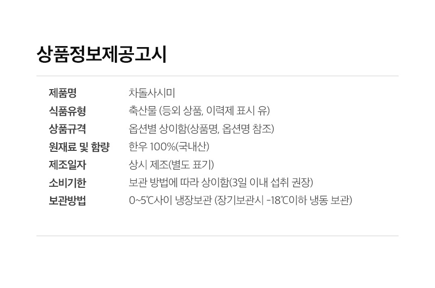 - 축산물 - 「축산법」에 따른 등급 표시(1++ 등급 국내산 쇠고기의 경우 「소ㆍ돼지 식육의 표시방법 및 부위 구분기준」에 따라 근내지방도 정보를 포함하여 표시), 「가축 및 축산물 이력관리에 관한 법률」에 따른 이력관리대상축산물 유무