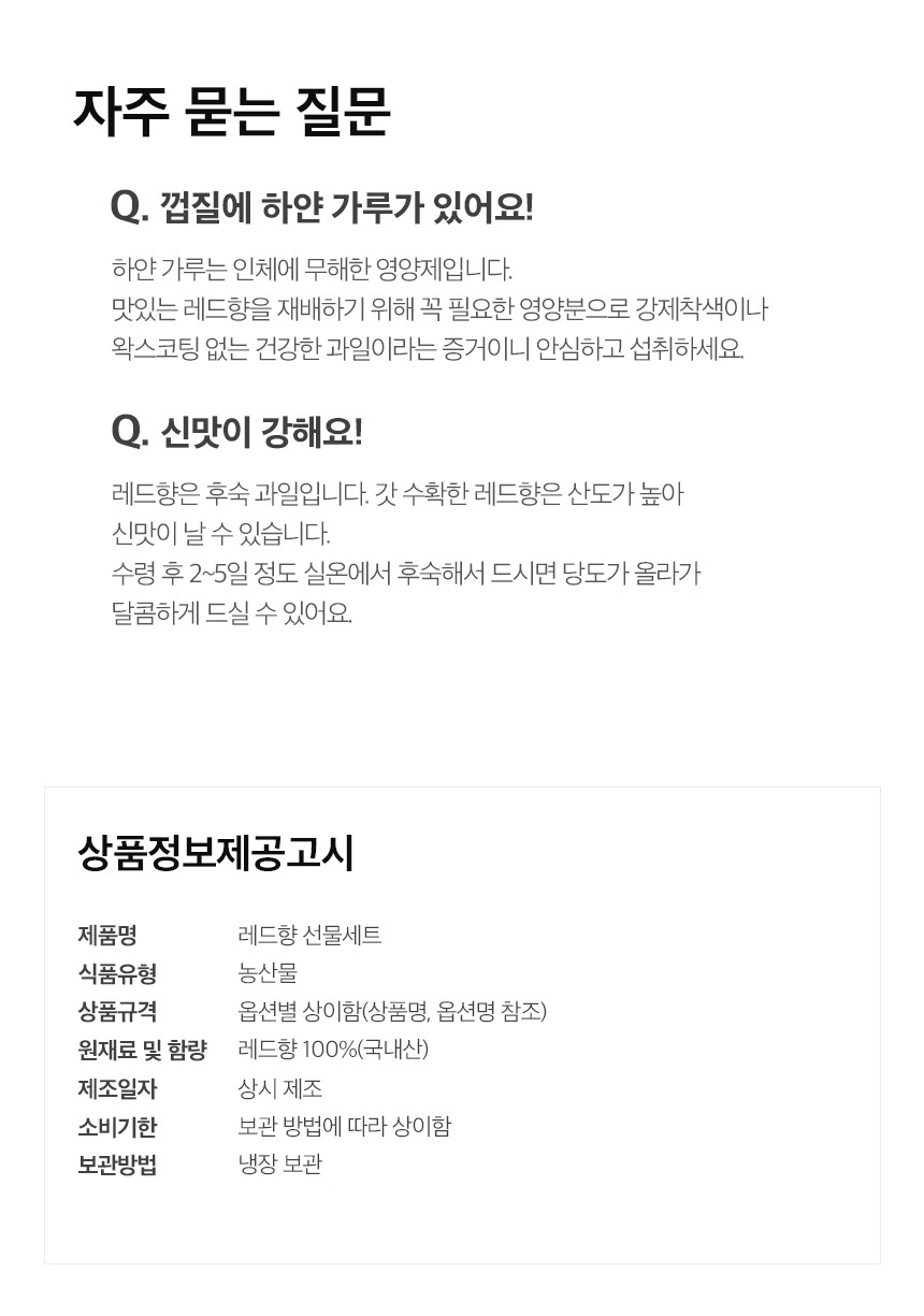 • 신선식품의 경우 재판매가 불가능한 제품 특성상 단순변심 및 개인적 입맛 차이로 인한 반품은 불가능하며 제품 수령 후 문제가 있는 경우 이상부분 사진 촬영하여 수령하신 날짜 기준 2일 이내 연락해주셔야합니다.(기일은 업체별 상이할 수 있으니 수령즉시 연락 부탁드리겠습니다.)
