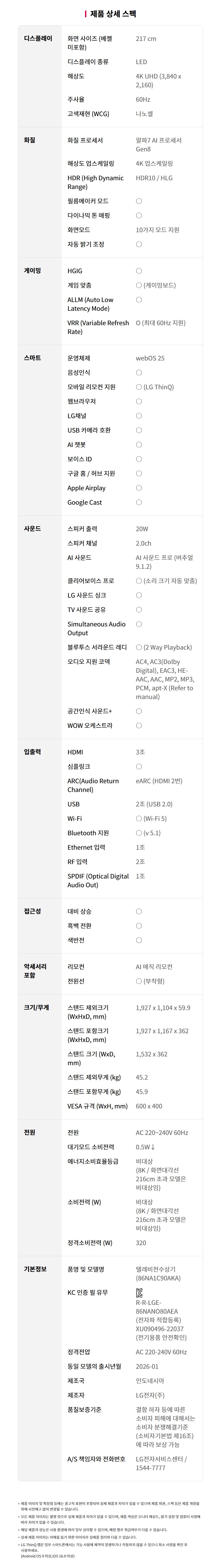 [LG전자] 나노셀 AI 86인치 (86NA1C90AKS/W)