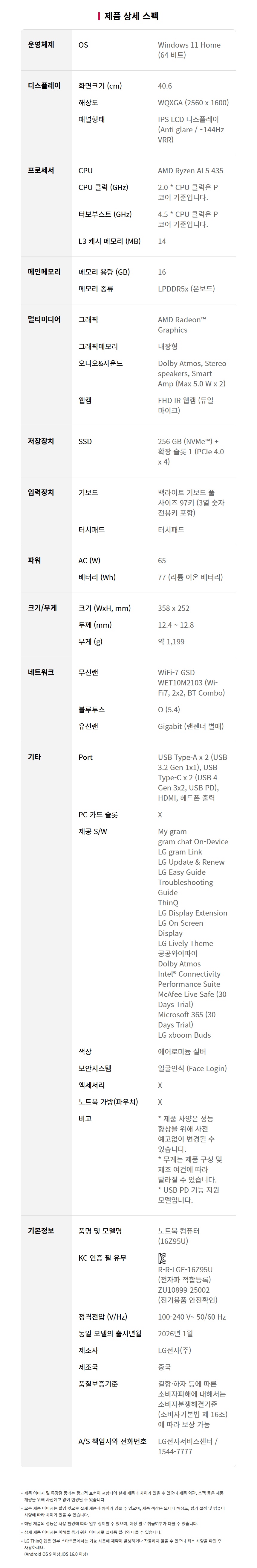 [LG전자] 16인치 그램Pro AI 2026 (16Z95U-GS5BK) /AMD 라이젠 AI 5 / RAM 16GB / SSD 512GB / 윈도우11 홈