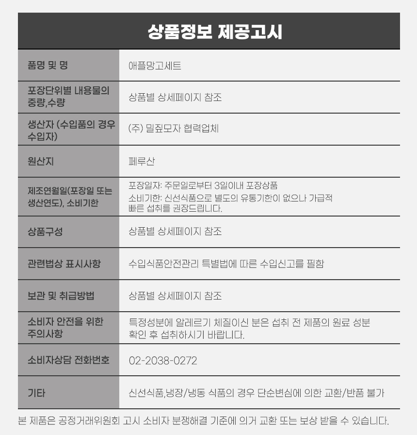 • 신선식품의 경우 재판매가 불가능한 제품 특성상 단순변심 및 개인적 입맛 차이로 인한 반품은 불가능하며 제품 수령 후 문제가 있는 경우 이상부분 사진 촬영하여 수령하신 날짜 기준 2일 이내 연락해주셔야합니다.(기일은 업체별 상이할 수 있으니 수령즉시 연락 부탁드리겠습니다.)