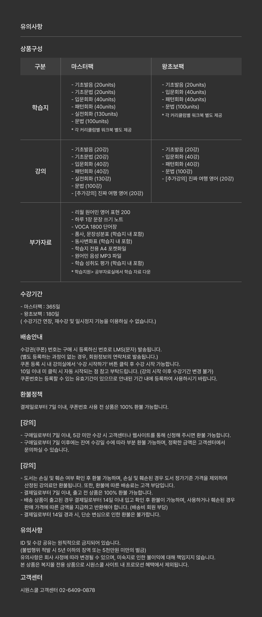• [교환 및 반품 기타 취소규정] 1. 수강 쿠폰 등록 전에는 7일이내 전액 환불이 가능하며, 수강 쿠폰 번호 등록 이후에는 환불이 불가능 합니다. 2. 시원스쿨 취소/환불 규정에 의함