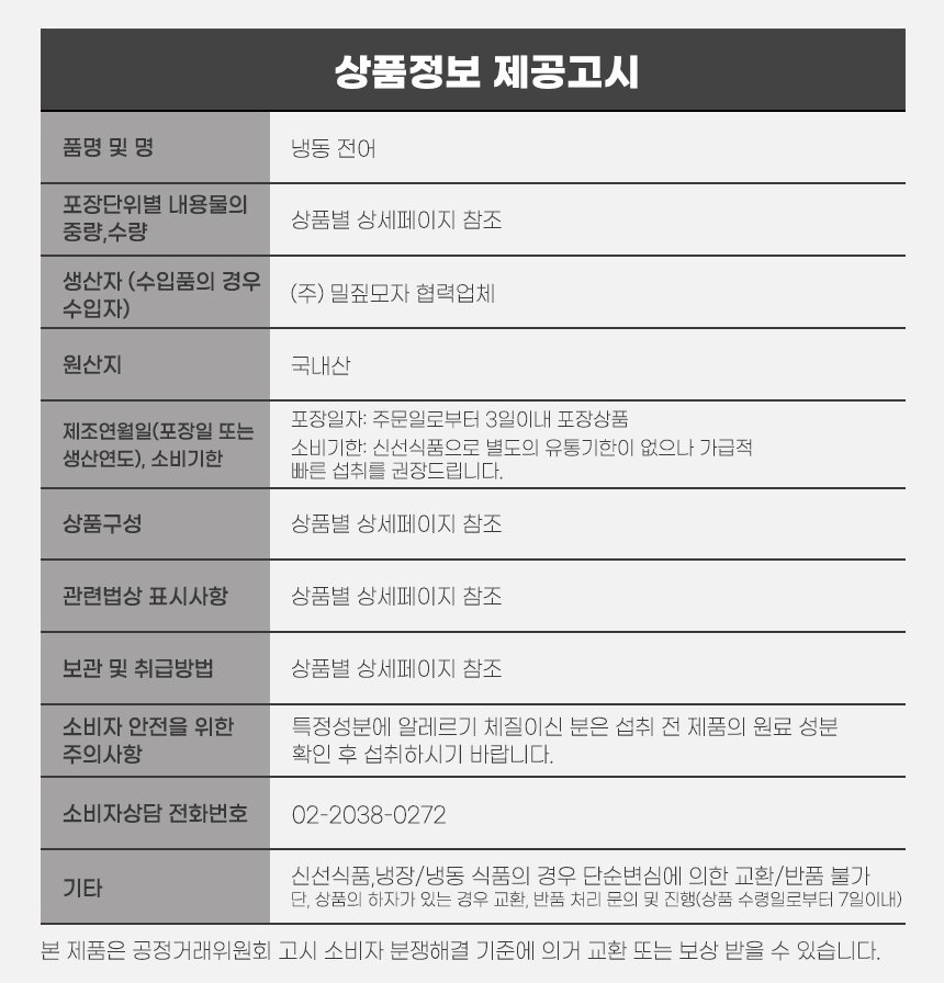 • 신선식품의 경우 재판매가 불가능한 제품 특성상 단순변심 및 개인적 입맛 차이로 인한 반품은 불가능하며 제품 수령 후 문제가 있는 경우 이상부분 사진 촬영하여 수령하신 날짜 기준 2일 이내 연락해주셔야합니다.(기일은 업체별 상이할 수 있으니 수령즉시 연락 부탁드리겠습니다.)