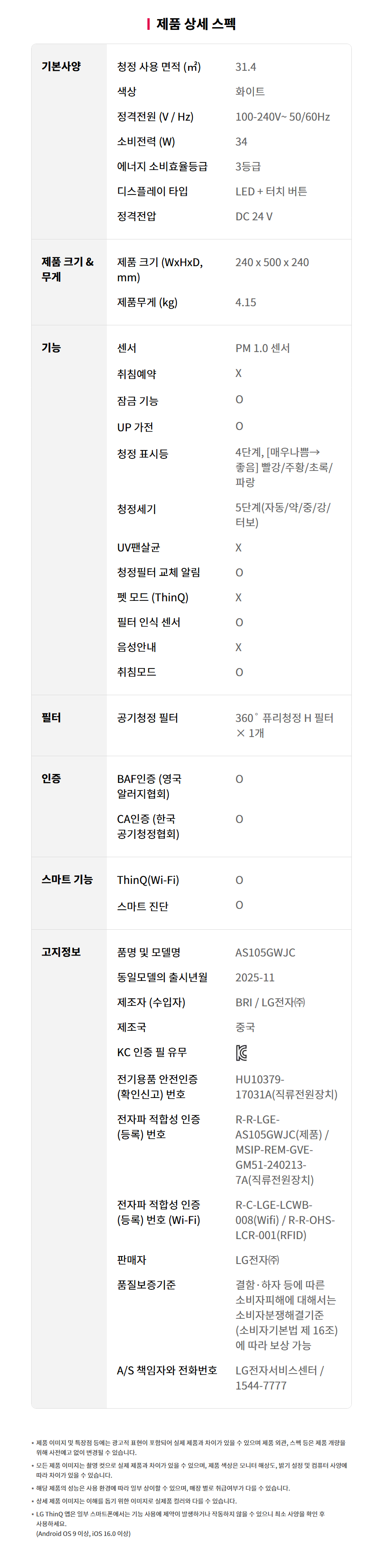 [LG전자] 퓨리케어 에어로 Hit 10평 3등급 (AS105GWJC)